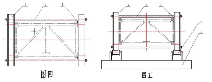 框架固定式工裝如圖四所示:由兩塊鋼結構件的端板(件1)及四根聯接桿(件2)組成。兩端板應保證聯接孔的位置度、四根聯接桿要長度一致,這樣才能保證焊接工裝有較高的精度。使用時,先將焊好聯接套的主弦桿用安裝到端板上,其中一側用楔鐵(件3)頂緊,另一側則緊貼端板,再將其它構件與主弦桿點焊,點焊后將結構件卸下,并完成全部焊縫的焊接。這種工裝的優點是:結構簡單,制造成本較低,加工效率高,精度較高。缺點是:不能在工裝上完成全部焊縫,由于主弦桿一側是由楔鐵頂緊的,所以標準節在這一側的精度會受到一定影響。