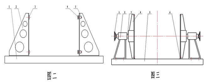 彎板式工裝如圖二所示:由一塊5m長平臺(件1)和兩個焊接彎板(件2)組成,其中,一塊彎板的角鋼座(件3)為固定式,另一塊彎板的角鋼座(件4)為伸縮式,兩塊彎板用T型螺栓分別與平臺聯接。使用時,先將主弦桿一端放置在固定式角鋼座的槽內,通過絲桿(件5)將伸縮式角鋼座伸出,與主弦桿頂緊,然后將節臂架的斜腹桿按照要求點焊成型。 后,將節臂架從工裝上取下,整體焊接并清理。這種工裝結構的優點是:結構簡單,工裝成本較低。缺點是:工裝精度低、焊后標準節精度低,受工作空間的影響標準節在工裝上只能點焊,不能完成整體焊接,焊接工作效率低。